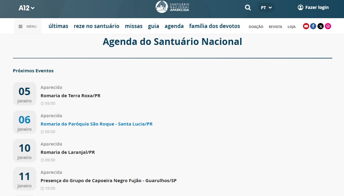 Procuramos no site oficial do Santuário Nacional de Aparecida, na seção de eventos, e não há nenhuma menção ao fechamento da Porta Santa! No dia 6 de janeiro de 2026, está programado apenas uma romaria:
