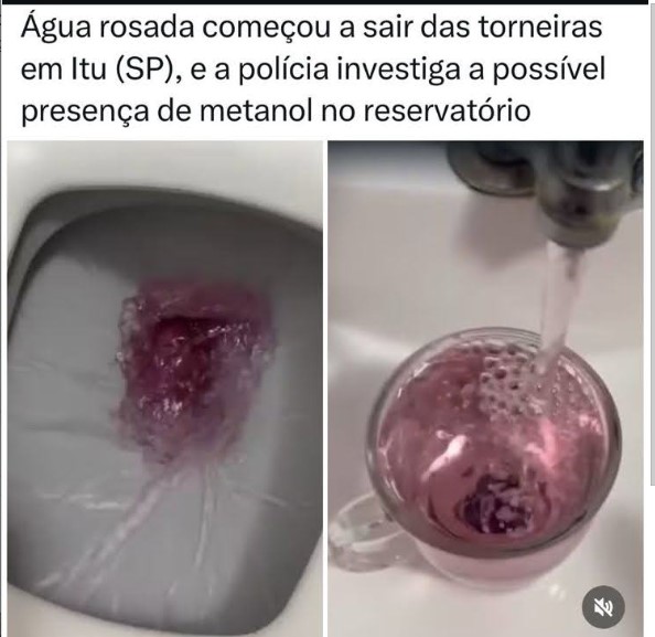 É verdade que a água com coloração rosa começou a sair das torneiras em Itu–SP e as autoridades estariam investigando se há contaminação por metanol?