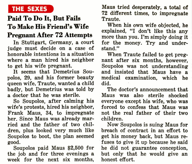 No entanto, depois de seis meses de tentativas (três vezes por semana!), descobriu-se que Frank – o contratado – também era estéril e não podia engravidar a belíssima mulher. A história ficou mais séria ainda depois que a esposa de Maus foi obrigada a admitir que os dois filhos do casal não eram dele!
