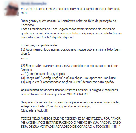 A ideia seria a de que, ao realizar o que o tal aviso sugeria, o usuário impossibilitaria que pessoas de fora de seu ciclo de amizades vissem suas atualizações, fotos e compartilhamentos.