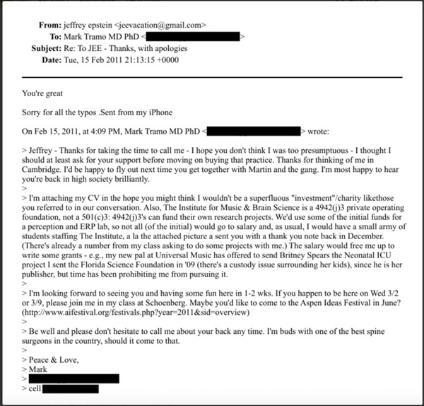 No e-mail, o professor pede apoio financeiro para Epstein conduzir uma pesquisa no Instituto de Música e Ciência do Cérebro, dirigido pelo professor. A pesquisa, chamada de “projeto de cuidados neonatais”, não tem nada a ver com clonagem de seres humanos e sim sobre os efeitos da estimulação musical na audição de bebês prematuros.