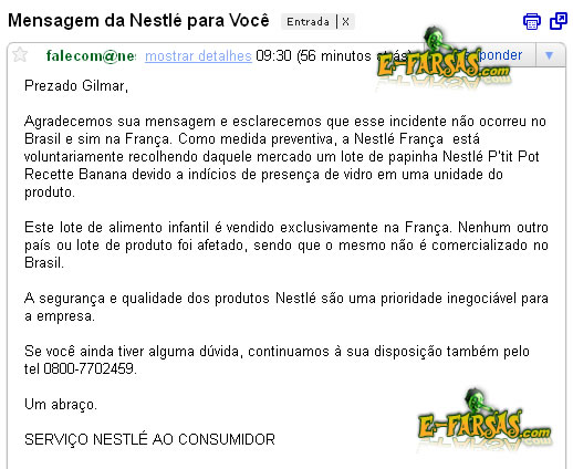 Entramos em contato, via e-mail com a Nestlé do Brasil e no mesmo dia tivemos a seguinte resposta da empresa: