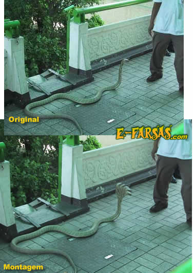 Não detectamos possíveis manipulações digitais na última imagem (aquela que mostra um estranho animal dentro de um pequeno rio). Acreditamos que deva se tratar de um boneco, ou um brinquedo, que foi colocado ali no córrego para dar a impressão de que se tratava de uma cobra rara. Perceba que não foram mostradas fotos de outros ângulos.