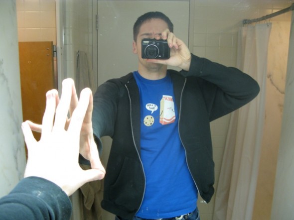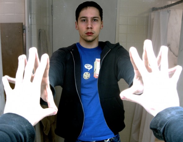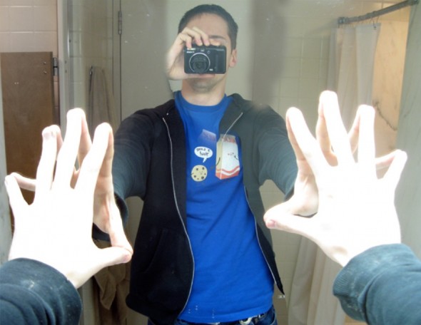 Essa é a pergunta que acompanha a imagem abaixo. Nela podemos ver um rapaz em frente ao espelho. O mais curioso da foto é que a câmera não aparece na cena, deixando muita gente queimando neurônios para tentar descobrir como a pose foi feita.