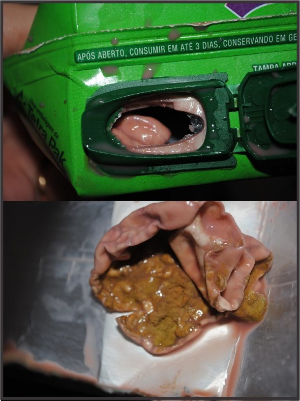 “Ontem abrimos uma garrafa de Ades de Uva para o Renan e logo que ele começou a beber falou que estava com gosto ruim e jogou fora. Como ele é muito enjoado e o Alan provou e disse que estava bom, deixei. À noite ele tornou a falar que estava ruim. Peguei e joguei tudo na pia. Qual não foi o meu espanto quando vi que depois de ter esvaziado a garrafa uma gosma começou a sair”