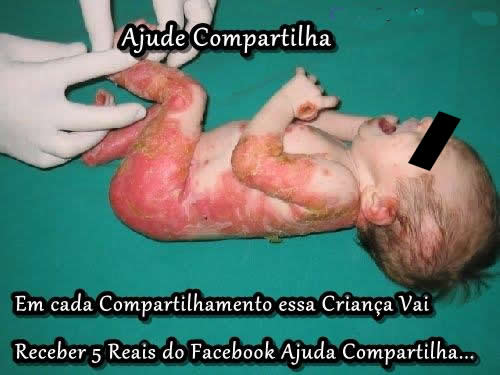 Para cada compartilhada no Facebook, bebê com feridas por todo o corpo ganhará R$ 5,00 do Facebook para ajudar em seu tratamento. Será mesmo?