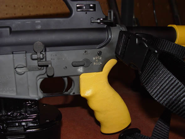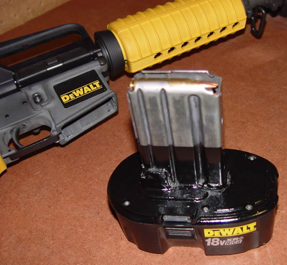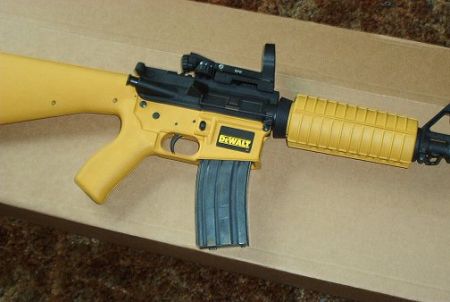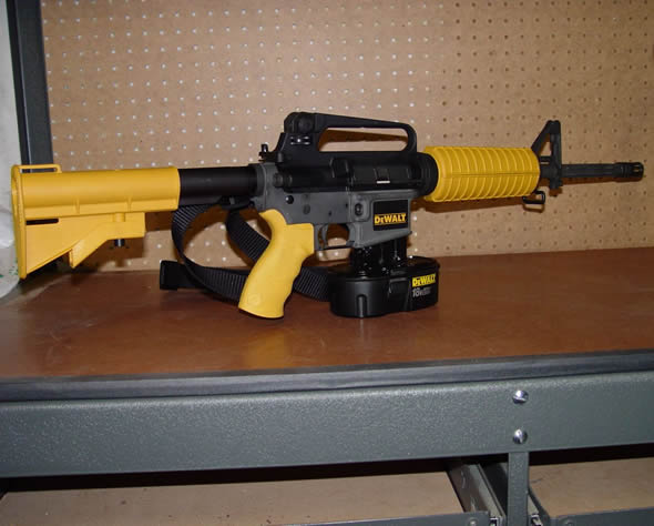 A arma que aparece na foto que está circulando por aí é uma obra do norte-americano David Wiggins. No blog ToolMonger – voltado para o público que gosta de ferramentas -, Wiggins explica que se inspirou em outra montagem de um rifle pintado com a cor amarela, semelhante às ferramentas da DeWalt, que apareceu na internet em 2008: