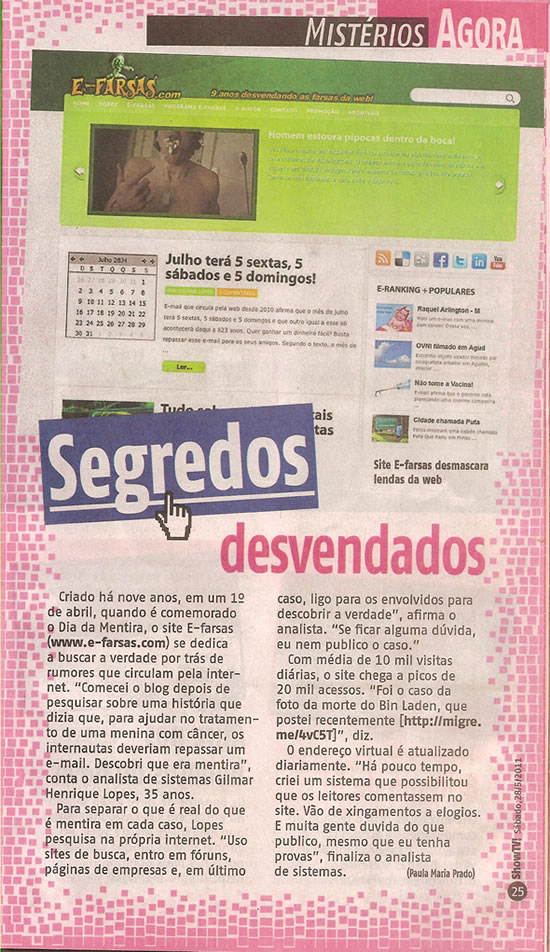 O E-farsas.com foi indicado no encarte ShowTV do jornal Agora São Paulo como dica de site.
