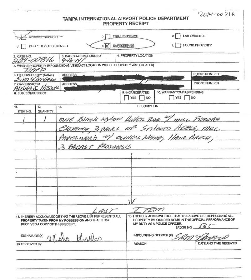 Pois é! A moça havia perdido uma prótese de três seios (que foi recuperada logo em seguida). Abaixo, uma cópia do recibo do Aeroporto Internacional de Tampa: