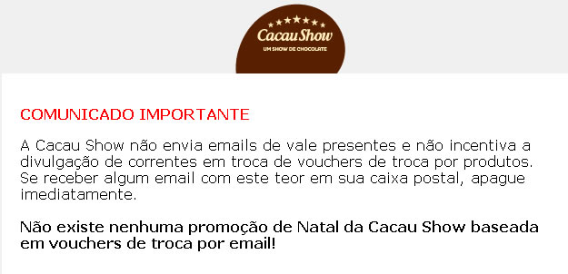 Aviso no próprio site da Cacau Show explica que a história é falsa! (http://www.cacaushow.com.br/natal/aviso.html)