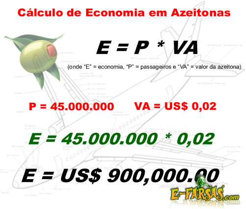 Portanto, em teoria seria possível se economizar até 900 mil dólares em um ano. Bastando para isso, apenas retirarmos uma simples azeitona de cada uma dos milhões de saladas servidas junto com as refeições nos aviões.