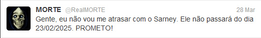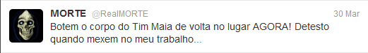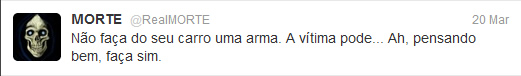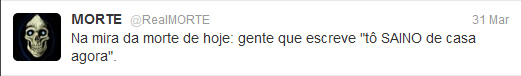 @RealMorte – Sempre fui fascinado pela ideia da morte. Não que eu deseje morrer ou que não ame a vida, pelo contrário, sou uma pessoa até bastante feliz e realizada no que faço. Mas ainda que eu ame a vida, sempre mantive a “consciência da morte”, que é a ideia de que qualquer um de nós pode morrer a qualquer minuto, seja atravessando a rua ou engasgando em casa. Para mim a pergunta certa não é “O que você faria se soubesse que hoje é seu último dia de vida?” a pergunta certa para mim é: “Sabia que hoje pode ser o seu último dia de vida?”. Foi por isso que quando conheci o Twitter decidi brincar com o personagem da Morte, a rede é a ferramenta perfeita para exercitar uma reflexão diária, e o humor foi apenas uma forma leve que encontrei para falar sobre um assunto pesado. Uma espécie de “bombom com fel”: dou o doce da piada, mas sempre sobra um amargor lá no fundo. Não estou ali para brincar com a tristeza ou rir de tragédias, tanto que quem me segue sabe que tenho meus limites e raramente abuso. Acho divertido ver os meus seguidores comentando “Não sei por que eu ri disso” ou “Eu ri muito, mas não é engraçado. Sou louco?”. Acho isso ÓTIMO. Fazer piadinha por fazer qualquer imbecil que saiba abrir uma conta no Twitter faz, mas fazer uma piada e ainda sobrar uma reflexão é para poucos.