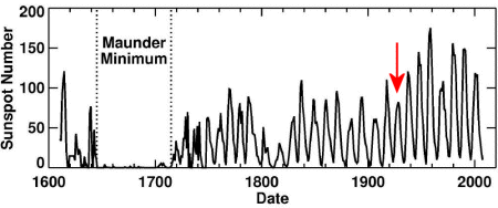 Números: anual por média de manchas solares de 1610 a 2008. Os investigadores acreditam que o ciclo solar 24 próximo será semelhante ao ciclo que chegou ao auge em 1928, marcado por uma seta vermelha. Crédito: NASA / MSFC