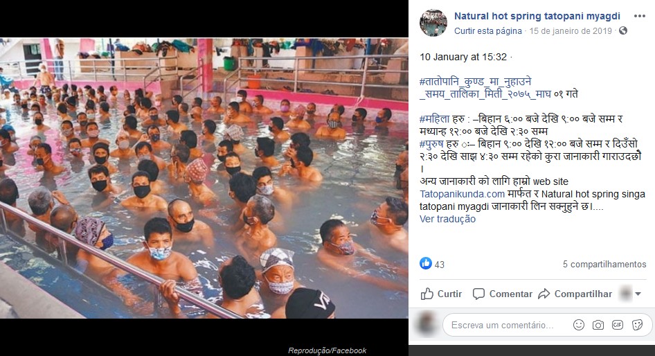 Na verdade, essa foto retrata a principal piscina de água termal de um “complexo” chamado “Tatopani Kunda”, no Nepal! A foto já aparecia publicada na página desse centro, no Facebook, desde 15 de janeiro de 2019 (a foto teria sido tirada no 10 daquele mês), ou seja, há quase um ano e meio, e muito antes do início da atual pandemia (arquivo).