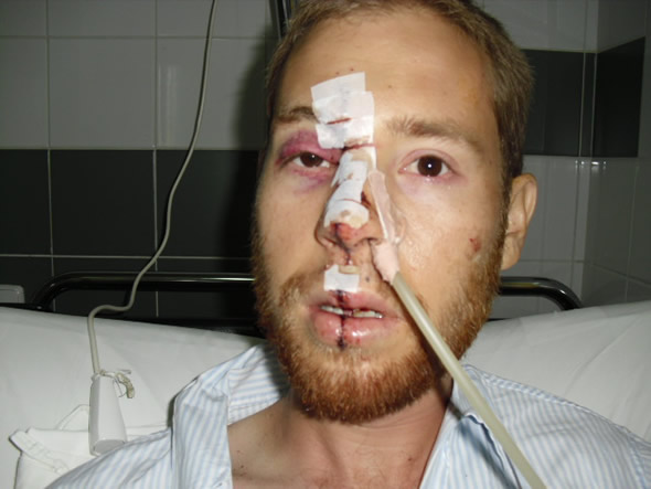 A foto que mostra o rapaz com o rosto cortado é, na verdade, de um acidente não fatal ocorrido em 2011 com um jovem de 24 anos chamado Alan Dennis. Em uma bela manhã quente em uma pequena vila na República Democrática do Congo quando o missionário estava usando uma ferramenta elétrica de corte de metal para criar formas de moldar tijolos. Sim, era um trabalho voluntário.