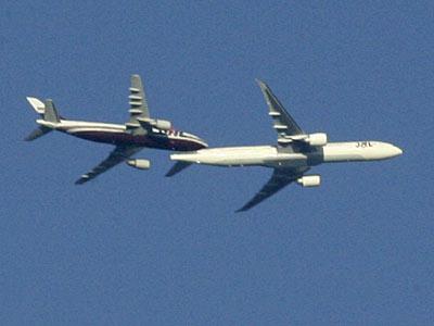 A cena aconteceu de verdade no dia 28 de janeiro de 2006 – às 3:00hs da madruga com os aviões da Japan Airlines e da DHL Global Delivery Service. E essa cena acontece todos os dias nos céus próximos aos aeroportos do mundo todo. Mas os aviões não chegam a se tocar! Na verdade, por uma medida de segurança, os aviões têm de suas distâncias rigorosamente controladas de maneira que eles fiquem distantes milhares de metros uns dos outros.