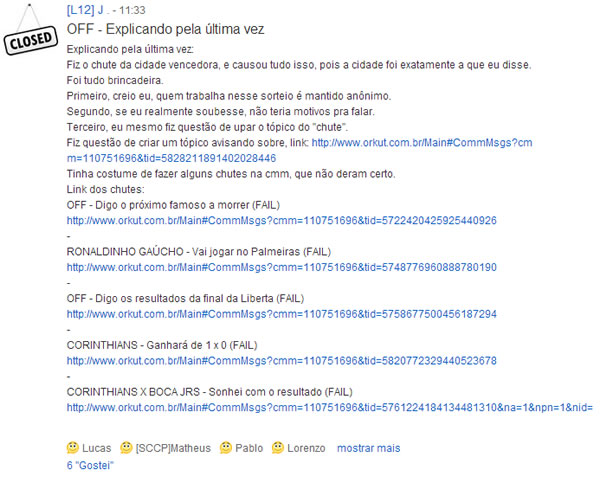 Conforme o próprio “[L12] J” explicou em outra postagem sua no Orkut, esse foi apenas um palpite dos vários outros que ele já fez na rede social: