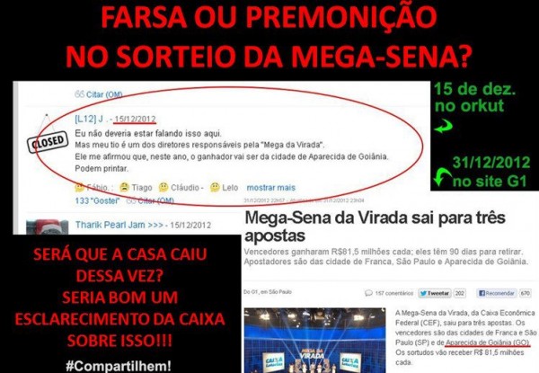 No último dia do ano de 2012, uma postagem começou a se espalhar pela web. De acordo com a notícia, um usuário do Orkut teria avisado que o próximo ganhador da Mega Sena da Virada seria um morador da cidade de Aparecida de Goiania – em Goiás – e que essa informação teria sido passada para ele através de um tio que trabalha na organização dessa loteria.