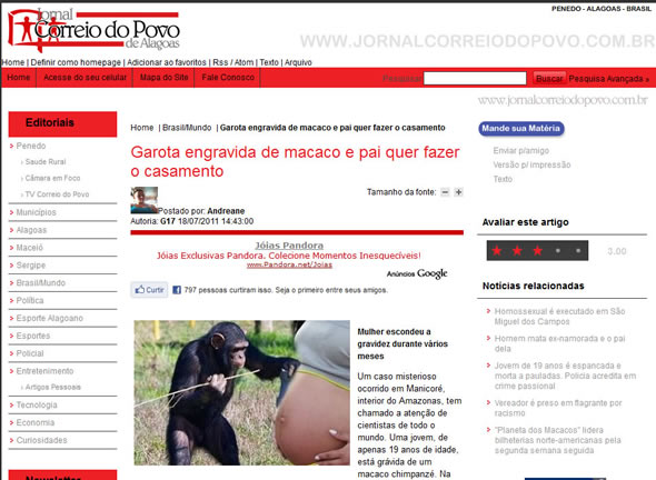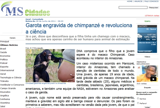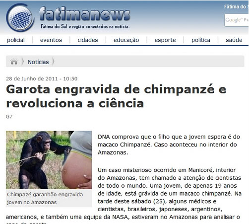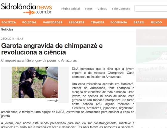 De acordo com o texto, o estranho caso teria ocorrido em Manicoré, no interior do estado do Amazonas. Uma moça de 19 anos estaria grávida de um macaco e atraiu a atenção de vários cientistas do mundo todo. Até uma equipe da NASA foi chamada para estudar a gravidez inédita na história da humanidade.
