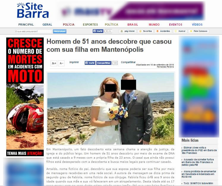A notícia apareceu na web no dia 9 de setembro de 2015. De acordo com a reportagem, um homem de 51 anos descobriu por meio de exame de DNA que está casado a 9 meses com a própria filha de 23 anos!
