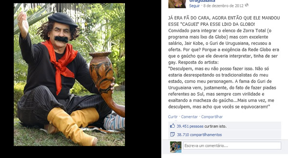 Em janeiro de 2013, uma historia começou a se espalhar em diversos blogs e nas redes sociais: De acordo com várias publicações, Jair Kobe – ator que interpreta o Guri de Uruguaiana nos teatros gaúchos – teria afirmado que recusou um convite para trabalhar no humorístico Zorra Total, da Rede Globo.