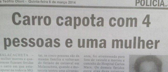 Recorte de um jornal que apareceu no Facebook no dia das mulheres mostra estranha manchete discriminatória contra o sexo feminino. Será verdade? A imagem apareceu no dia 8 de março de 2014 no Facebook e em diversos grupos do WhatsApp. Nela podemos ver um recorte de um jornal com a seguinte manchete: “Carro capota com … Continue lendo Erramos – “Carro capota com 4 pessoas e uma mulher!” é real!