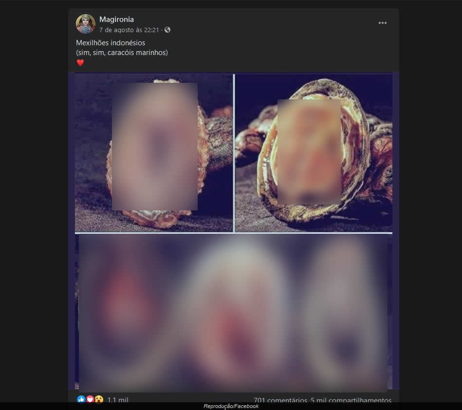 Recentemente, no dia 7 de agosto de 2020, uma página brasileira no Facebook chamada “Magironia” propagou uma série de fotos de supostos “mexilhões indonésios”, que por sua vez teriam o formato de “vaginas” (arquivo). Desde então, a publicação já obteve mais de 5 mil compartilhamentos!