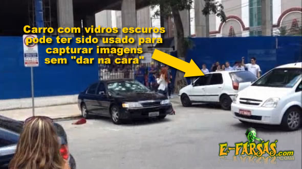 Além disso, note que há um carro branco, estacionado estrategicamente ao lado da encenação. O automóvel tem os vidros bem escuros para, supostamente, poder filmar a cena com mais privacidade.