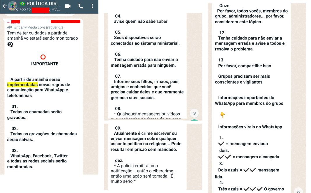 Texto de uma das versões compartilhadas através de grupos de WhatsApp em março de 2023: “A partir de amanhã serão implementadas novas regras de comunicação para WhatsApp e telefonemas. 01. Todas as chamadas serão gravadas. 02. Todas as gravações de chamadas serão salvas. 03. WhatsApp, Facebook, Twitter e todas as redes sociais serão monitoradas. 04. avise quem não sabe saber 05. Seus dispositivos serão conectados ao sistema ministerial. 06. Tenha cuidado para não enviar a mensagem errada para ninguém. 07. Informe seus filhos, irmãos, pais, amigos e conhecidos que você precisa cuidar deles e que raramente gerencia sites sociais. 08. Quaisquer mensagens ou vídeos que você tenha na frente do governo ou do primeiro-ministro sobre política ou a situação atual… etc. Não envie. 09. Atualmente é crime escrever ou enviar mensagem sobre qualquer assunto político ou religioso… Pode resultar em prisão sem mandado. 10. A polícia emitirá uma notificação… então o cibercrime… então uma ação será tomada. É muito sério. 11. Por favor, todos vocês, membros do grupo, administradores… por favor, considerem este tópico. 12. Tenha cuidado para não enviar a mensagem errada e avise a todos e resolva o problema. 13. Por favor, compartilhe isso. Grupos precisam ser mais conscientes e vigilantes – Informações importantes do WhatsApp para membros do grupo 1. ✔ = mensagem enviada – 2. ✔✔ = mensagem alcançada – 3. Dois azuis = ✔️✔️ mensagem lida.- 4.Três azuis = ✔️✔️✔️ O governo tomou nota da mensagem. – 5. Dois azuis e um vermelho ✔✔✔ = O governo pode tomar medidas contra você. – 6. Um azul e dois vermelhos = o governo verifica suas informações – 7. Três ✔✔✔ vermelhos = O governo entrou com uma ação contra ele e ele receberá uma intimação em breve. Seja um cidadão responsável e compartilhe com seus amigos. O importante é enviar o próximo grupo mais cedo…” (foto: Reprodução/WhatsApp)