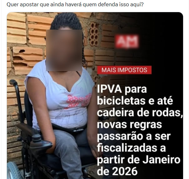 A alegação voltou a circular nas redes sociais no final de novembro de 2025, sendo bastante compartilhada também em grupos de WhatsApp. Segundo que se espalhou, o Governo Federal teria mudado as regras de trânsito para começar a cobrar o Imposto sobre a Propriedade de Veículos Automotores (IPVA) também de usuários de bicicletas e de cadeiras de rodas!