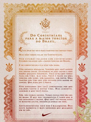 Durante a Copa Santander Libertadores, a Nike criou uma campanha para provocar os anticorintianos. Em uma carta enviada a vários torcedores rivais do Timão, a empresa incitava a ira de quem torcia contra o Corinthians. Era quase certo que os corintianos gostariam da zoeira, não fosse a Nike ter feito uma brincadeira similar na Argentina (país que seria rival do Brasil na final). Pegou mal pra empresa torcer para os dois lados!