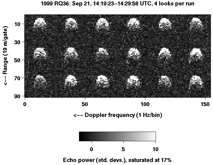 As únicas imagens que existem do 1999 RQ36 são essas, feitas a partir de radares de eco de Gladstone em setembro de 1999, quando o asteroide estava a “apenas” 17 milhões de quilômetros de distância da Terra:
