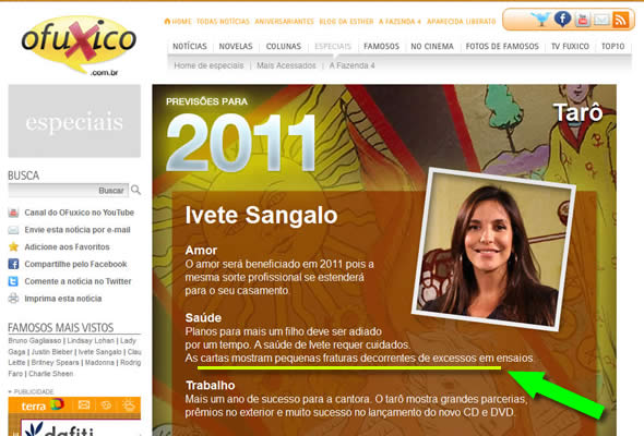 Já, o site O Fuxico foi mais ousado e “previu” que Ivete Sangalo teria problemas de saúde, mas seriam possíveis fraturas em decorrência da enorme quantidade de ensaios feita pela cantora.