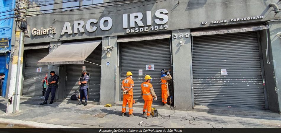 Outra foto mostrando funcionários da Prefeitura de São Paulo soldando portas de um estabelecimento comercial.