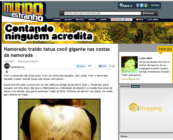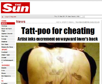 No final de novembro de 2011, uma incrível história começou a se espalhar pela web! De acordo com jornal britânico The Sun, o tatuador Ryan Fitzjerald teria tatuado fezes, como forma de vingança, nas costas de sua ex-namorada.