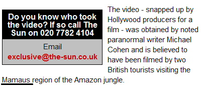 O periódico The Sun deu um show de como não se fazer uma reportagem. Começando pela descrição do local onde teria acontecido o tal avistamento do ET. De acordo com a matéria, os turistas filmaram o alien em “Mamaus”, mas queriam dizer “Manaus”. Esse erro também foi reproduzido por outro jornal importante por lá, o Daily Mail.
