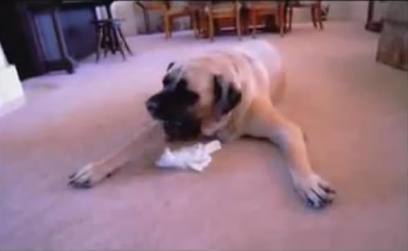 A brincadeira dos dois estava animada até que, em certo ponto do vídeo, o Mastiff engole o cãozinho! Será que isso é verdade mesmo?