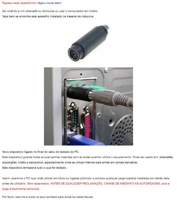 O alerta não é novo! Circula pela web há vários anos e sempre volta a aparecer nas redes sociais e em blogs. De acordo com o texto, é preciso tomar muito cuidado ao usar computadores em lan houses, hotéis ou em cybercafés, pois pode haver um pequeno dispositivo conectado entre o teclado e o desktop.